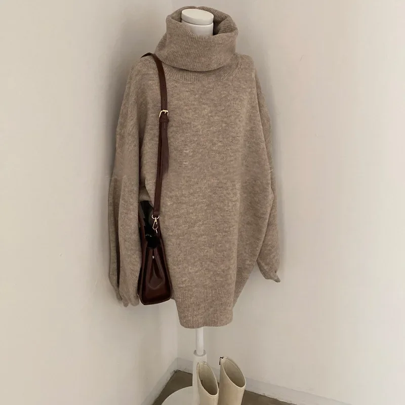 Maglione-abito oversize in maglia morbida, pensato per offrire comfort e stile in un’unica soluzione. Il design a collo alto dona un aspetto raffinato, mentre la vestibilità ampia e fluida avvolge la figura senza segnare, garantendo libertà di movimento. Le maniche lunghe leggermente balloon aggiungono un tocco moderno e voluminoso, equilibrando la linea minimal del capo.